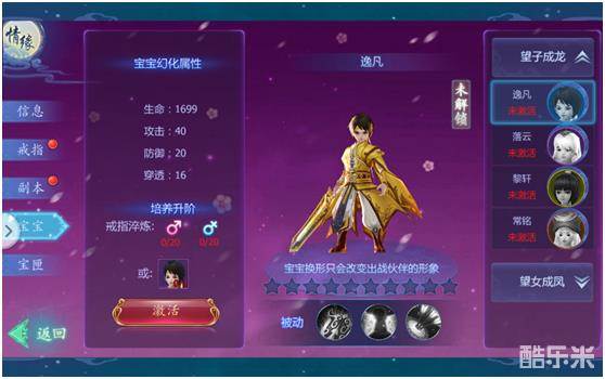 结婚后就要有属于你们的宝宝了呢,宝宝通过升级情戒等级激活,也可在商城购买激活,宝宝可以为您提供全面的属性加成哦~升级还可以幻化加成大量属性呢。快来一起培育属于你们的宝宝吧~