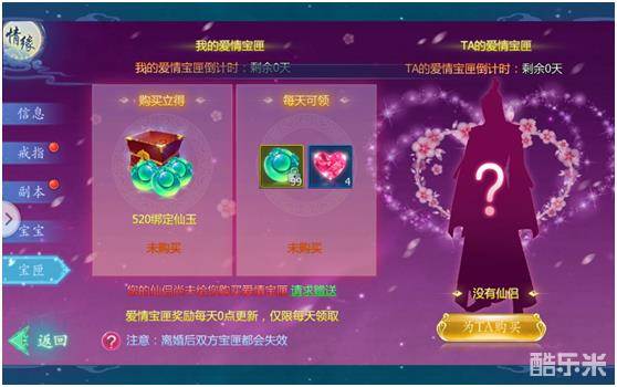 结婚后可为对方购买宝匣,激活后当日可领取520绑玉和一次日常奖励,在30天内,每天领取99绑玉和三生石奖励哦!快为心爱的他/她购买吧。