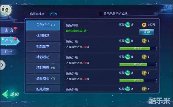 角色成长:主要通过角色战力、等级、转职等完成的,可以获得绑定仙玉和铜钱奖励。
