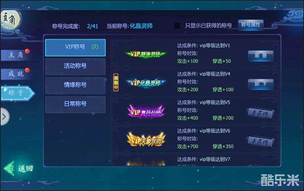 VIP称号:主要是通过提升VIP等级后的,获得称号的实效是永久的,同时也会获得称号附带攻击和穿透属性。