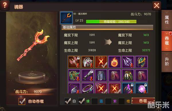 在吞噬界面,玩家可以根据系统提示自动吞噬装备材料,也可以勾选白色框和绿色框或者手动选择不需要的装备材料进行吞噬。完成吞噬任务后,魂器的吞噬经验升级,基础属性提升,并随之带来战斗力的提升。