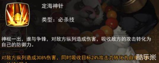 神棍一出,谁与争锋,在对敌方纵列造成伤害,吸收地方的攻击转化为自己的防御力。对敌方纵列造成308%伤害,同时吸收目标24%的攻击力转化为自身防御力,持续2回合。