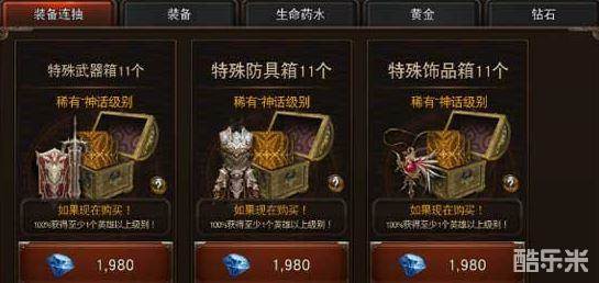 1. 装备连抽,可以花费钻石抽武器、防具、饰品,稀有到神话级别的,别抽。