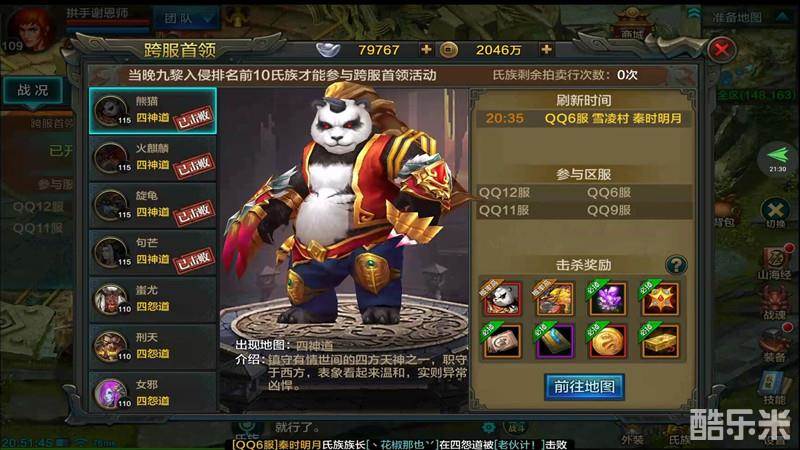在跨服首领活动开启期间,可通过天圣原(15,70)NPC奕劫进入到四象森罗宫地图。玩家们可组队并点击首领列表里的熊猫BOSS,自动寻路到BOSS所在的刷新点,提前到达指定地点做好抢归属准备。