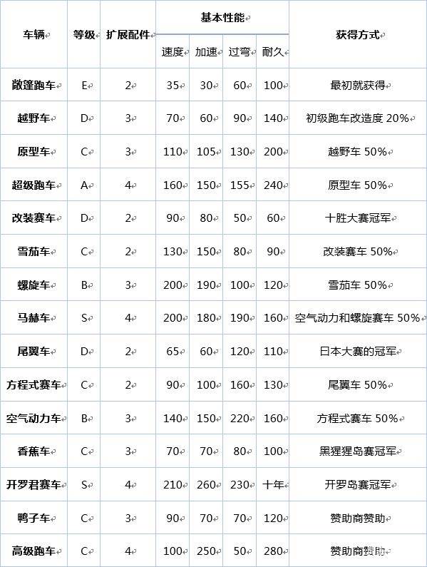 《冲刺赛车物语》里面的赛车各种各样,大家肯定超级想收集全部的车型。那他们到底有什么不同呢?小编特地整理出了一份表格,供大家参考。
