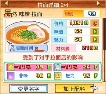 这一次的对手可不同于之前《百货商店物语》的对手。在《开罗拉面店》中,我们的竞争对手会不断的出现,这些竞争对手如果不赶走他们的话,会有更多的店铺出现。而每一家竞争店铺会降低我们店里部分拉面3%的属性,这个属性会随着竞争对手的增加叠加上去!老铁,你这也太不地道了,一个人来抢生意就算了,你还拖家带口来抢生意,公平竞争中不中!你怎么能群殴呢!!!