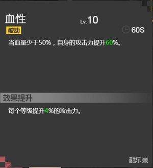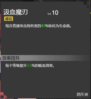 1技能是强化自身,最高可以将攻击提上60%再经过什么技能,暴击,队友强化,装备增幅将会提上一大截输出,但是需要控血,使其生命低于50%,吸血=损失,难度较大要把握好度,才可以换取稳定高输出, 建议:可以视情况放在前排,也可以主动买些血,来增加输出收益。