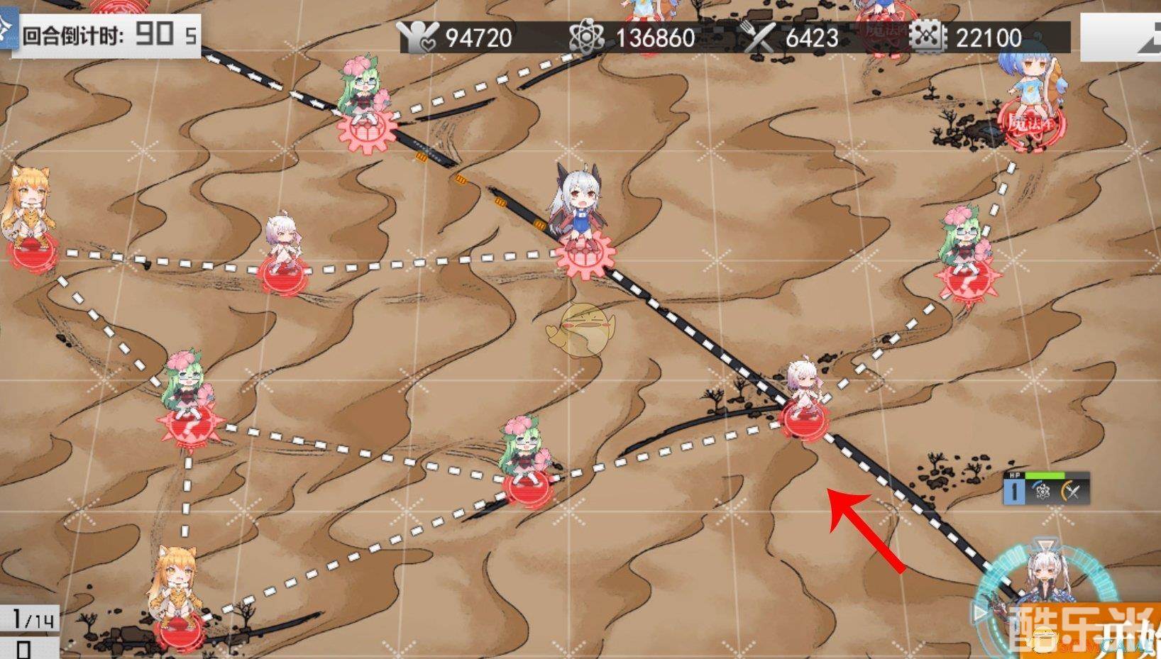 1、梯队1换位补资源,然后换位回来,再往右上移动1格。