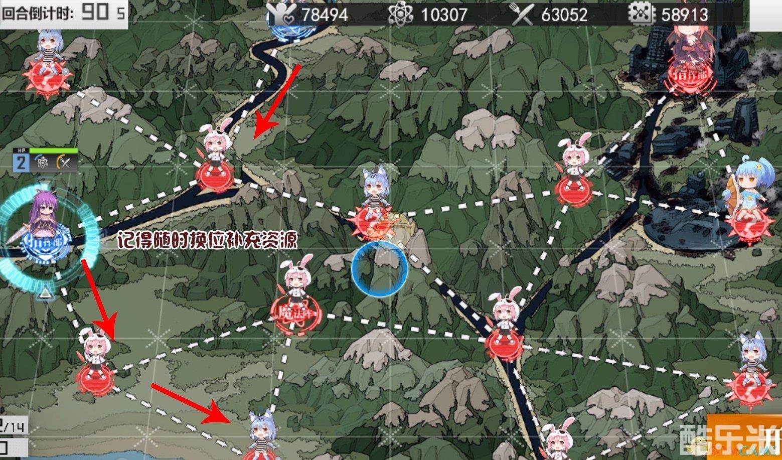 1、梯队1向下移动1格,和梯队2交换位置补充资源。