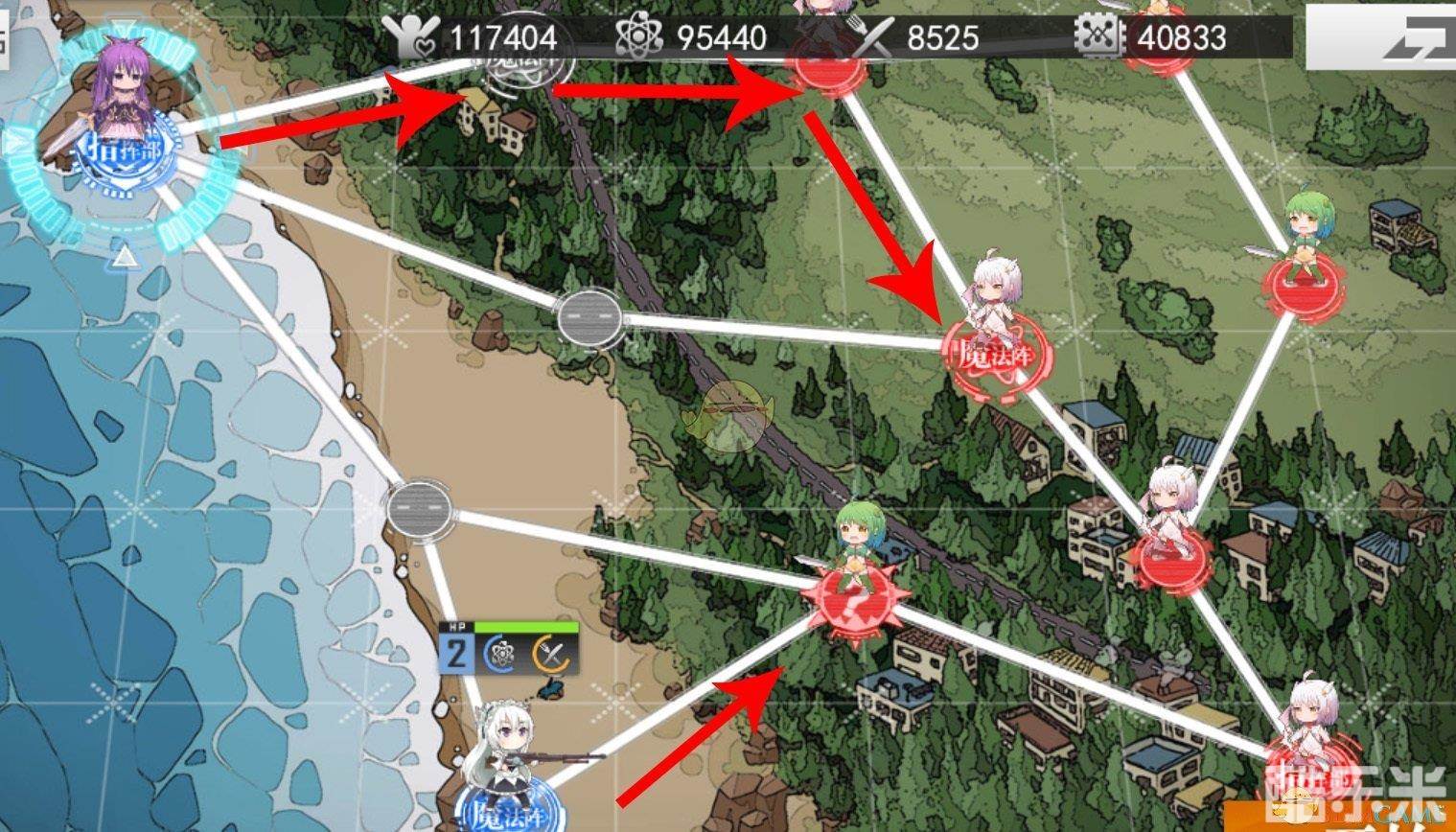 1、梯队1向右下前进3格占领右方魔法阵。