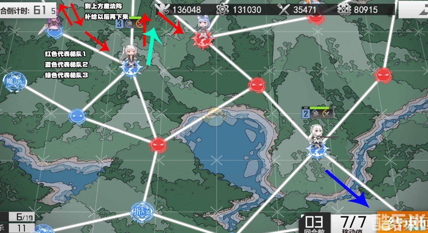 1、梯队1向上魔法阵移动进行补给,再下来,根据指示图往右上方移动占领魔法阵,过程中和梯队3进行换位。