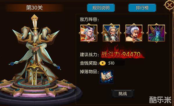 极限试炼30级是多数玩家反应比较难过的的关卡,当然越往后也越难。在关卡挑战前有建议玩家需达到的合适战力(94470战力),当然达到这个战力也不一定能过。