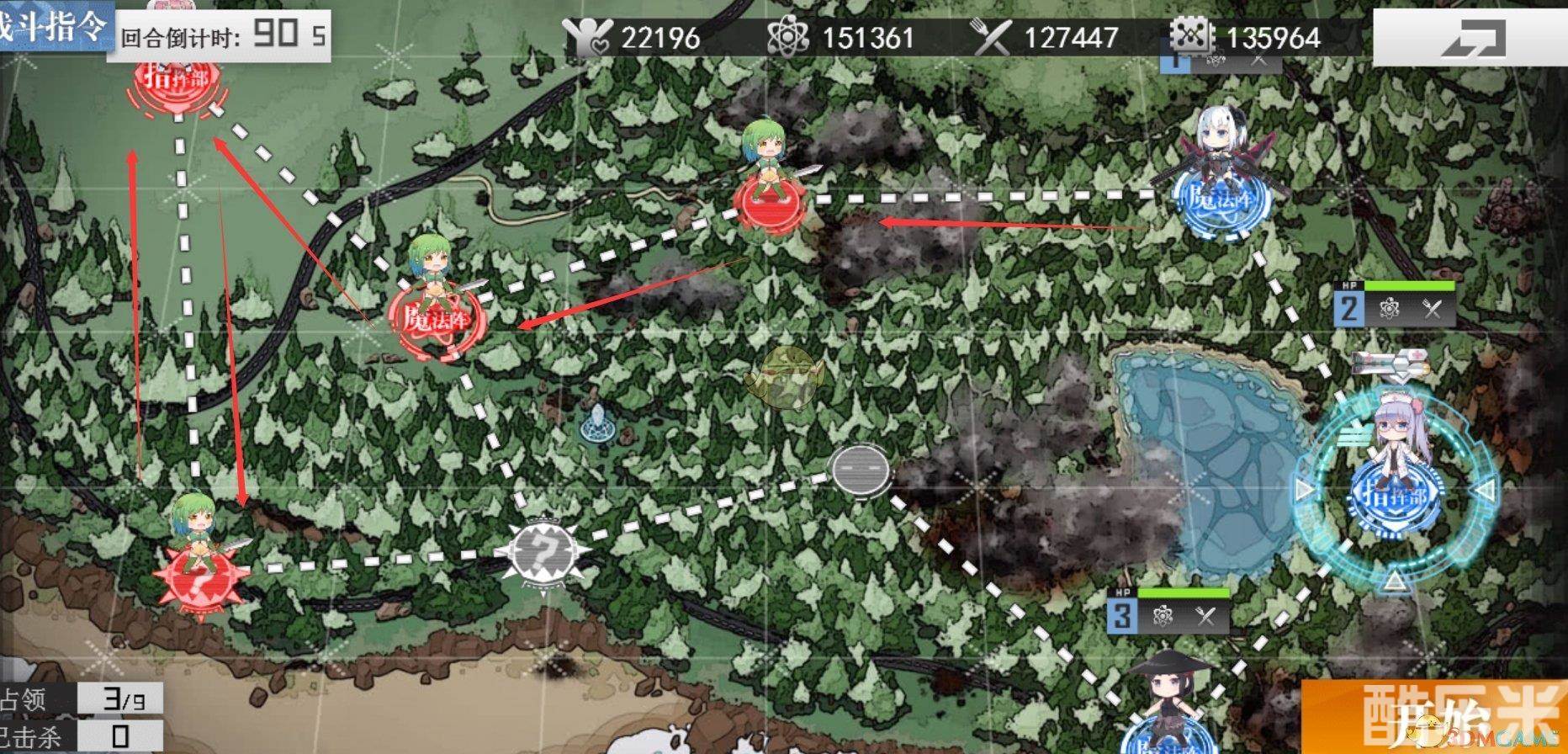 指挥部部署梯队2,上方魔法阵部署梯队1,下方魔法阵部署梯队3