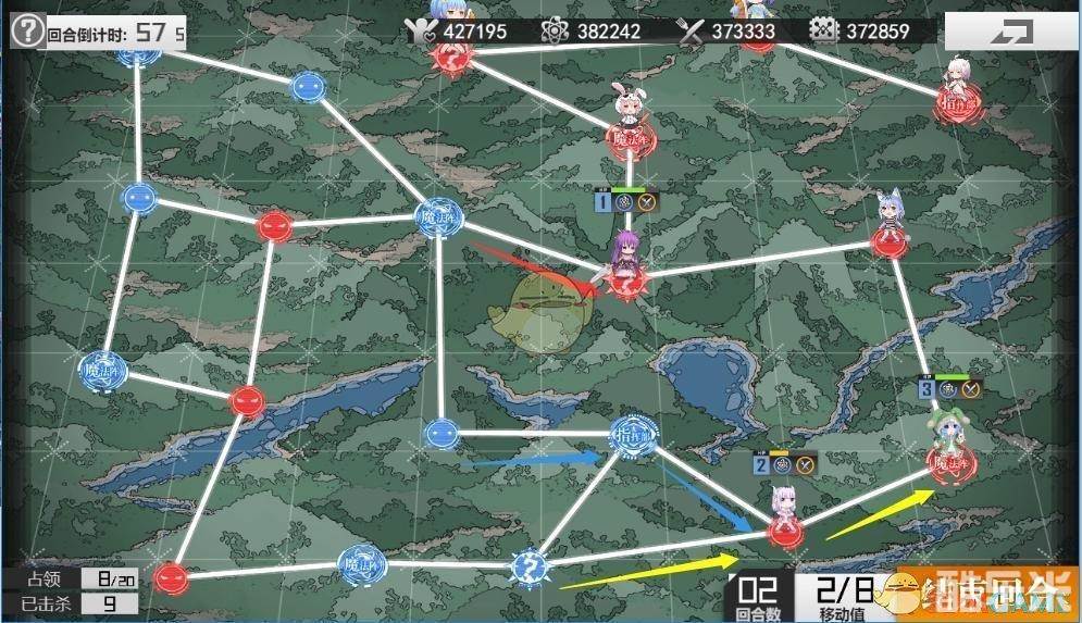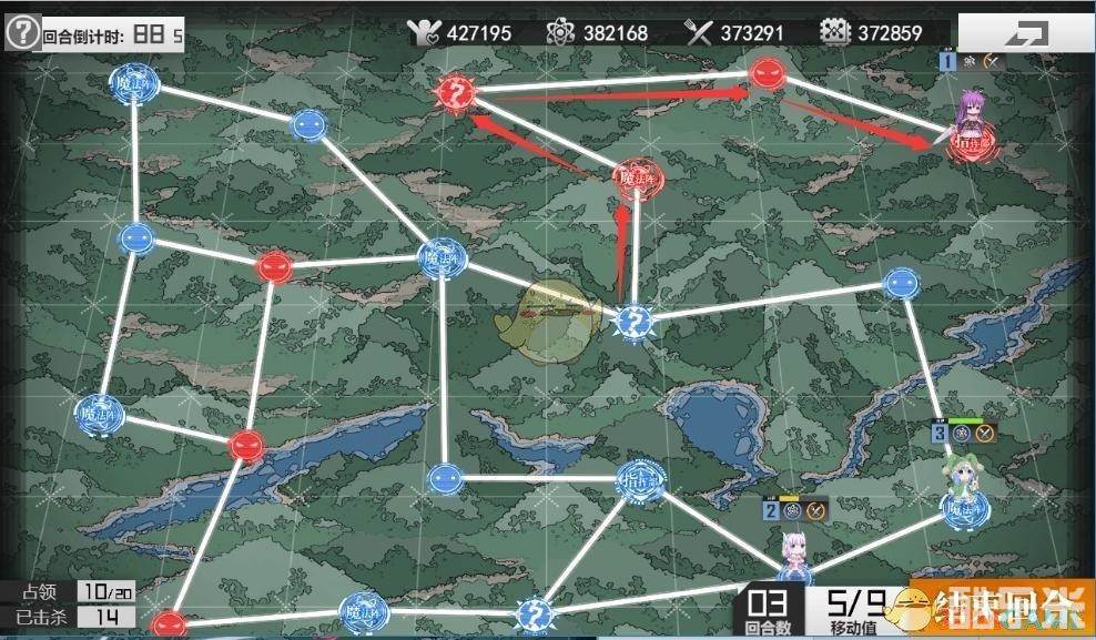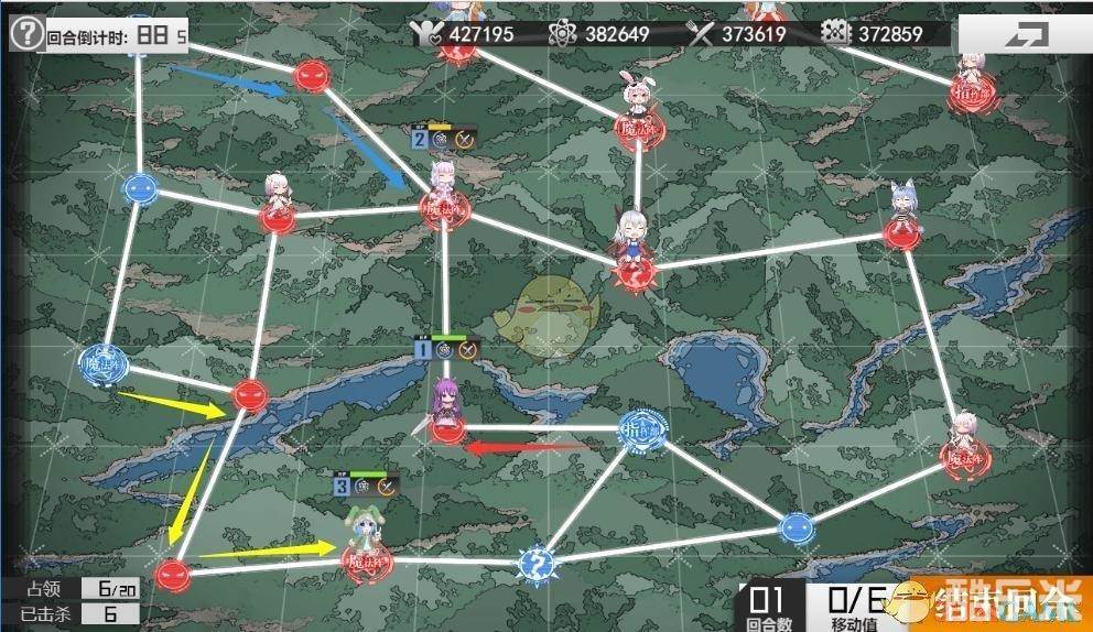指挥部部署梯队1,左上魔法阵部署梯队2,左下魔法阵部署梯队3。