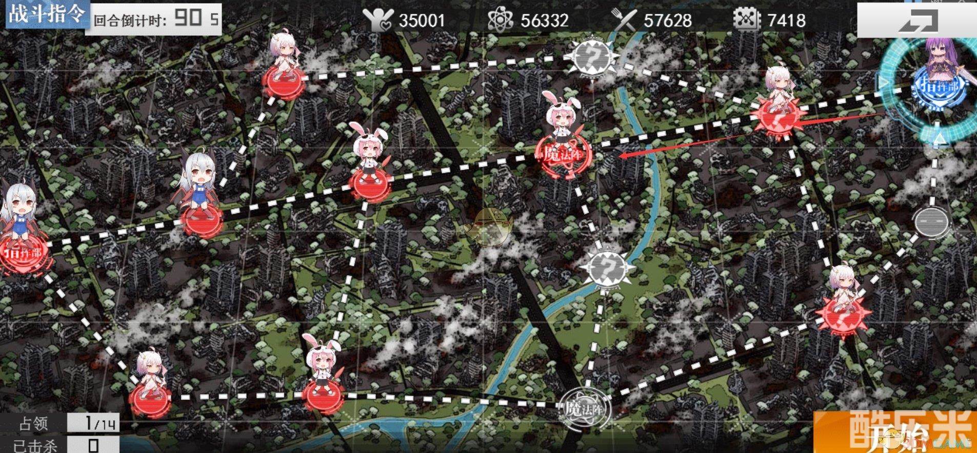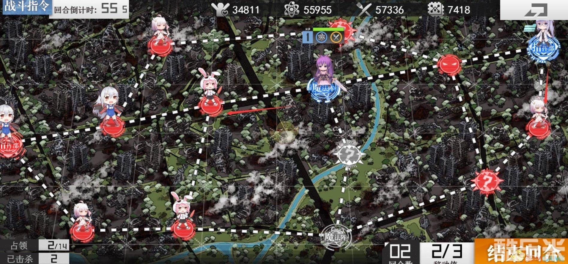 指挥部部署梯队1,向左前进2格占领魔法阵。