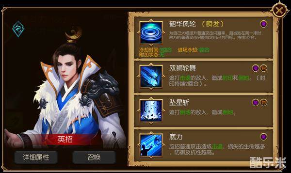 被动技能:底力-英招普通攻击造成击退,损失的生命越多,防御及抗性越高