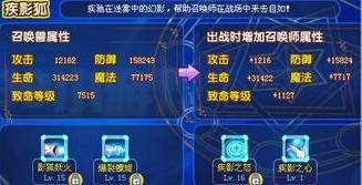 疾影狐属性图,属性没有宠物的高,致命是召唤兽中最高的!但至于攻击,魔法,生命,防御少于别的召唤兽。