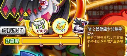 好感度达到30即可领取暗之翼兽魔卡兑换券,下周魔卡系统开放后,可以在魔卡领取处兑换暗之翼兽魔卡!