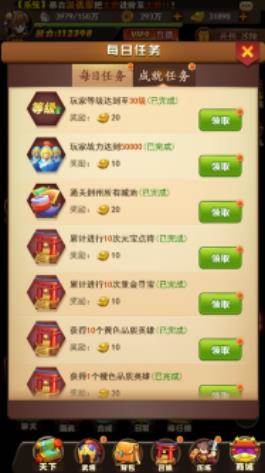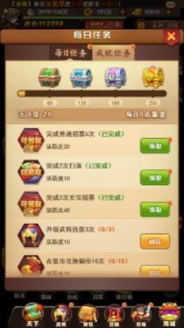 日常任务可在主公等级达到25级时开启,分为每日任务和成就任务。完成每日任务可以获得大量奖励并累积活跃度,当活跃度分别累积到80、130、180、250点时,可以开启道具宝箱,活跃度于每日0点重置。成就任务是当玩家满足一定条件时即可领取奖励,成就任务的奖励只能领取一次。