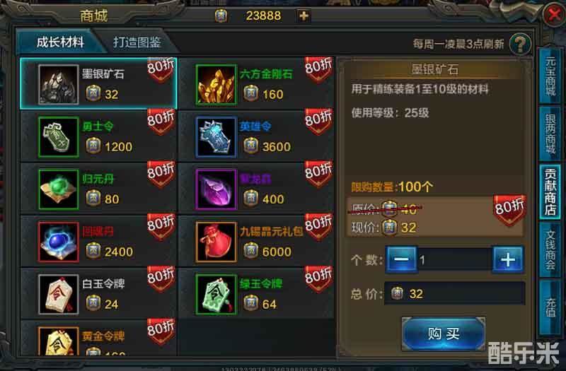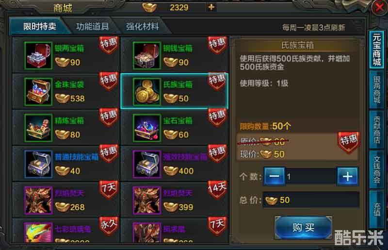 购买商城的氏族宝箱,宝箱特惠的价格是50元宝,限购数量50个,使用后可以获得500氏族贡献和500氏族资金。美酒的价格也是50元宝,美酒除了能在氏族盛宴中获得经验加成以外,也能获得500氏族贡献,美酒只有在氏族盛宴中才能使用一次,氏族盛宴中的经验加成达到50%后就无法使用了。此外,参与聚宝怪、世界首领、跨服首领等玩法时,获得的宝箱打开后也能获得氏族贡献奖励。