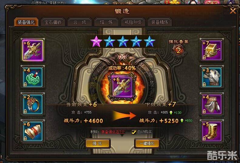 大家在强化过程中,强化会有一定的成功几率。当装备强化成功,装备星级会提高1级,装备属性会有相应提高;而装备强化失败的话,有可能降低装备的强化等级或强化等级保持不变。