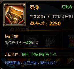 战无不胜战骑的技能可以通过使用战骑技能升级书来进行升级,升级过后的技能增加更高的人物角色属性。而作为战骑技能升级必备物品——战骑技能书可通过荣誉商店荣誉值兑换、战无不胜守卫京城活动,以及击杀帮派BOSS等途径来获得。