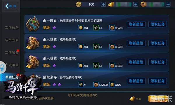 军功专属于各个军团内部,要在军团内部树立起自己的权威,没有大量的军功支持,可能有点说不过去。在《马踏千军》手游中,军功的建立需要英雄们坚持完成军团任务和参加军团争霸活动,并且海量的军团任务随时可以接取,实打实的军功来自战场上为军团的付出。