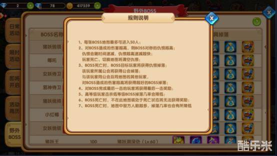 相关规则说明已经在截图中说明,特别说明的是野外BOSS地图玩家之间是可以互相PK的哦,所以不仅要小心BOSS造成的伤害,还需要小心其他玩家对你的骚扰!