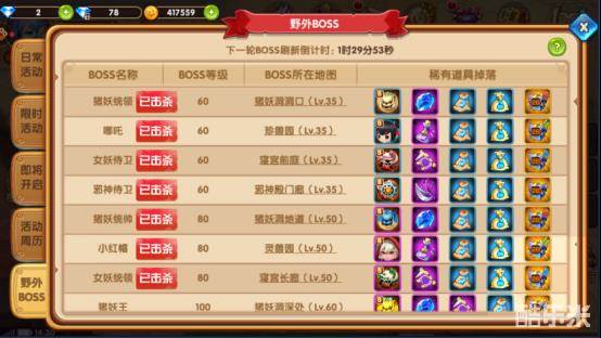 野外BOSS开启前系统会推送一条野外BOSS即将开启的公告,届时根据开启时间点击主界面上方的“野外BOSS”进入。
