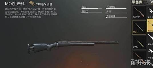 M24现在已经可以在地图上刷新,算是非空投枪中威力最大的一把枪。玩家可以用M24爆头,然后换上M762进行补刀,不然等M24换弹射击,速度太慢。M24最大缺点就是配件不通用,不过M24只要有托腮板就好,其他配件需求不是很高。