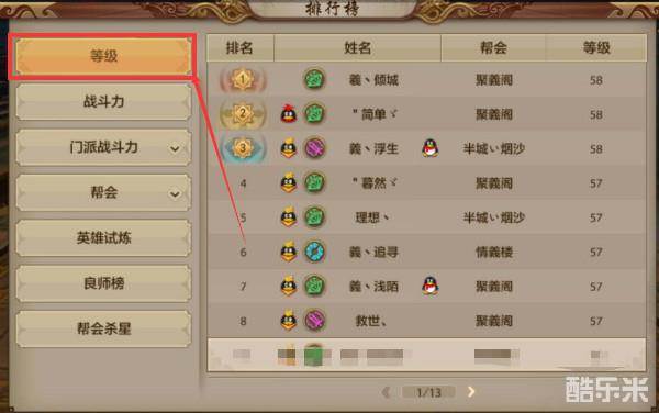 排行榜打开后的第一个排名就是玩家角色的等级排名,会排列出当前服务器的角色等级前100名的玩家,同等级的玩家,会按照达到等级的快慢速度来排名。等级排行榜上可以查看到每位上榜玩家的具体等级和帮会。