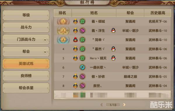 英雄试炼排行榜,可以查看到,当前服务器通关章节最多的前100名玩家,并且可以查看到他们的职业,所在帮会,姓名,以及英雄试炼达到的关卡数。