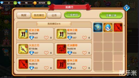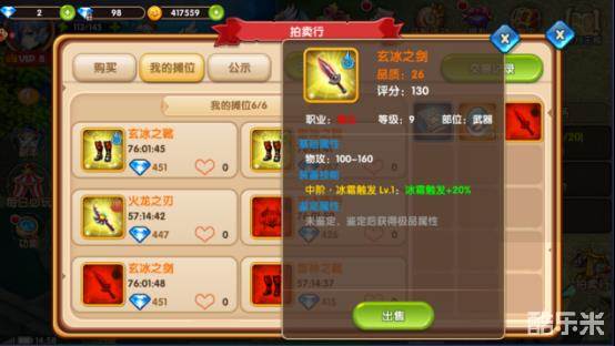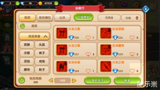 进入“拍卖行”后会显示其他玩家挂卖的装备列表,需要注意的是显示红色图标的装备是告诉你这个装备不是你当前职业的装备哦,所以你买了也无法装备。