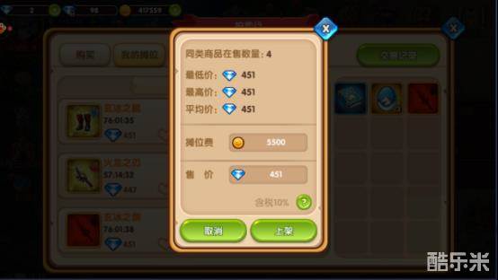 系统会根据同类商品在售数量给出一个平均价进行参考,你可以放低你的价格吸引其他人,如果你的装备属性是极品的话,那你可以自行在售价处修改卖出的价格,系统会收取10%的税费,最后点击“上架”就可以挂卖你的商品了!