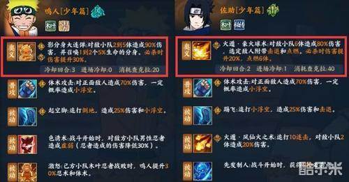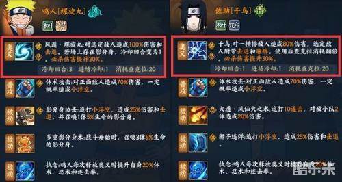 值得一提的是,鸣人和佐助这三个阶段的忍者卡牌都是独立的哦!也就是说每个忍者等级的鸣人和佐助,技能都是有所不同的,因此在分配阵容上,一定要想好该怎么分配,特别是在奥义和被动上,区别还是非常大的呢。如果想追求高爆发的,自然建议鸣人和佐助的最终形态九尾查克拉和咒印;但是如果是想打配合,建议使用“少年篇”,鸣人的色诱术可是相当强大的哟!
