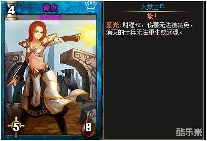 修女:紫色的4回合5攻击8血,橙色的6攻击10血,具圣光技能,远程一大活力输出。修女紫色已经有不低的攻击力,且还是圣光,伤害无法减免还对亡灵士兵具毁灭打击,且血量不低也让其在平推中也是比较主力的远程输出士兵。