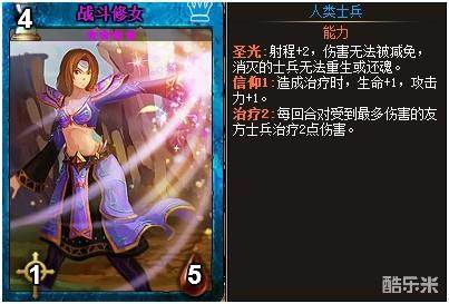 战斗修女:紫色4回合1攻击5血,橙色2攻击7血,拥有圣光,治疗2和信仰1技能。战斗修女是一张成长性卡牌,只要让她在场上待上几个回合,就会成为一张 攻高血厚还会治疗的高级士兵,但战斗修女血量实在不高,容易被对方秒杀,且紫色攻击力一开始只有1,决定其一上场就不能成为主力,因而更多用在副本中,pvp中玩家更多会选择修女长。