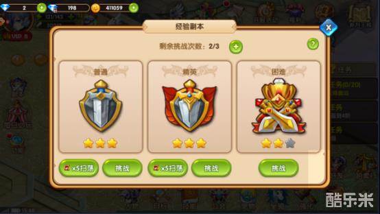 点击“每日必玩”选择“经验副本”,难度越高的副本获得的经验越多,在完成副本后获得大量的经验,当然也可以使用钻石领取双倍经验,每天可以挑战三次经验副本。