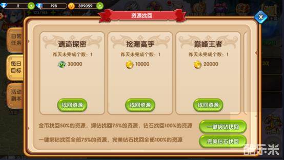 昨天没完成的任务,通过找回资源也可以获得经验,通过钻石找回获得的奖励更多哦。