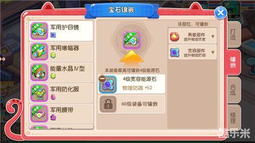 镶嵌宝石可以通过点击背包中的宝石进行镶嵌,同时也可以通过界面打造直接进入镶嵌。进入镶嵌界面后,每个部分都会有2-4种能源石可以进行镶嵌。在装备上方会注明该装备最高可镶嵌的能源石等级。