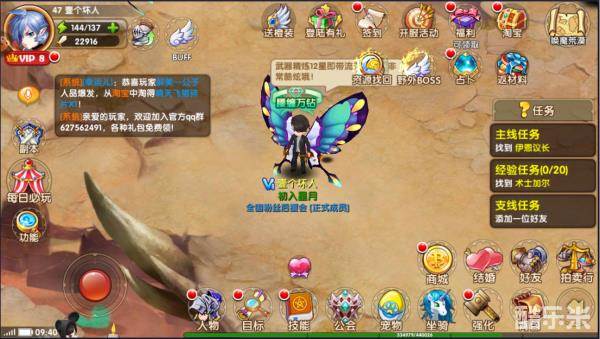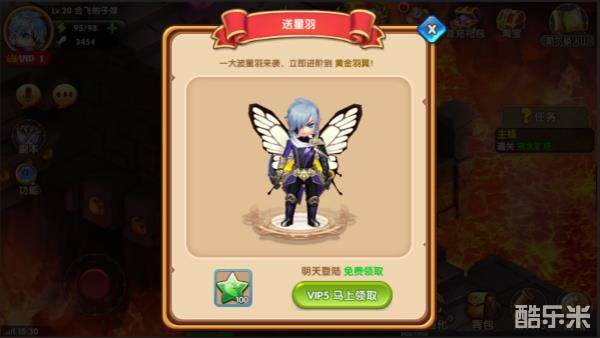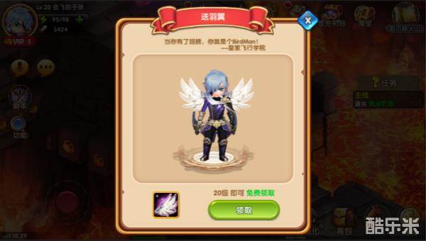 小伙伴们等级达到20级就可以点击领取羽翼图标领取一个漂亮的羽翼,是不是觉得很漂亮呢,赶紧装备上去吧