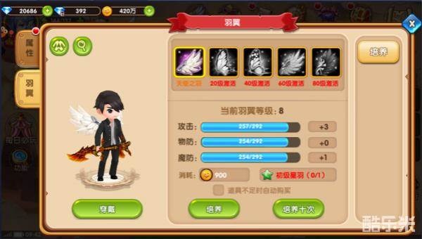 在这里可以对羽翼消耗-星羽进行培养升级噢,培养等级越高还可以激活更多的翅膀造型喔,而且会越加强大噢,是不是觉得很激动啦