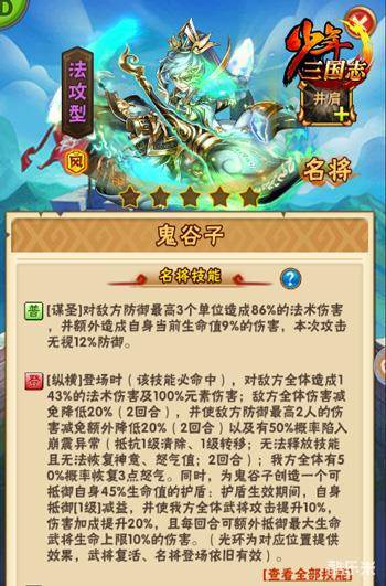 鬼谷子还可通过名将并肩、图鉴养成等多种玩法,提升全体阵容的属性加成。当鬼谷子搭配金色名将一起上阵时,并肩名将可为其增加攻击、生命等属性加成,并提高属性继承比例。