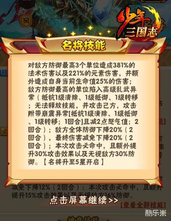 除了登场大招,鬼谷子还拥有强力的怒气必杀,可对敌方若干武将造成高额的元素伤害与法术伤害,并可对敌方防御最高的武将施加“乱武”状态。同时,该技能还可降低敌方全体武将的防御与最终伤害减免,多维度的控制打击,将极大削弱敌方实力。