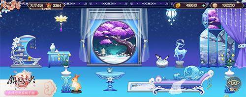梦幻唯美的蓝色星空风格,给人宁静、淡雅的视觉感受。繁星点点的星空壁纸瞬间让整个主厅充满意境,美妙的星空让人忘却一切疲倦。墙面装饰选择雕花六边窗和蔚蓝月洞门,门外、窗外浪漫的景色,使人内心安静祥和,告别失眠的夜。躺在星辰榻上与玉兔纸笼、飞鹿环画一同看屋外精致的景色、听轻柔的风声。此景只应天上有,人间唯有《锦绣未央》手游才得以满足。