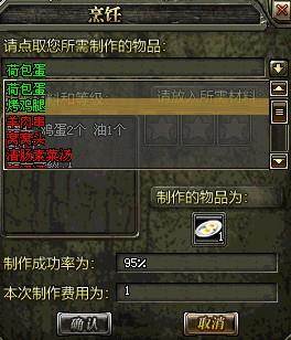 在下拉框中选择好所需烹饪的物品,会有对应的提示需的要原料与等级,满足需要的等级,放入所需的材料,点击确认,就开始了制作的过程,每种食品的制作成功机率都不相同,一般来说,越高级的食物烹饪起来难度越大,失败机率也会相对高,当然制作费用也有所增加噢。