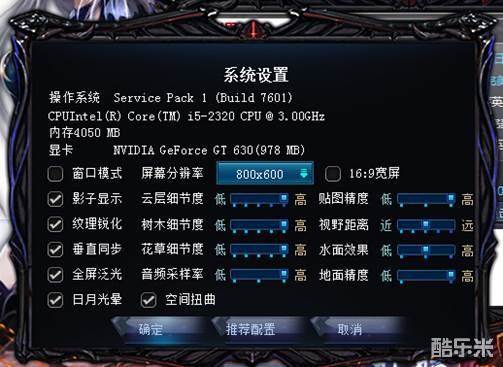 2、游戏更新完毕请您先选择系统设置,游戏会根据您的机器配置推荐给您一个已经设定好的系统设置,不过您也可以根据自己的需要进行调节。