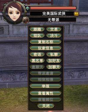 在其他玩家身上,组队列表中的名单,或选中目标的目标信息栏上,按住ALT再单击鼠标右键,可弹出此菜单。功能同其它窗口中相应按钮的功能相同