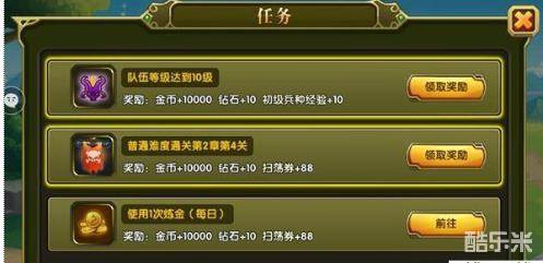 完成任务可以获得大量的金币奖励和材料,在主界面右侧点【任务】按钮即可进入任务界面。