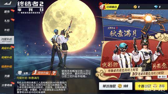 枪械涂装为AN94专属,这杆性能优良的小口径突击步枪深受玩家们的喜爱,《终结者2:审判日》为它定制的“秋意满月”涂装自然也个性十足——这款涂装拥有半月、半月、满月和暗月四种形态,酷炫程度依次增加,消耗月华即可提升涂装形态,月华的获取途径包括击杀对手获得或抽取月度补给免费领取。
